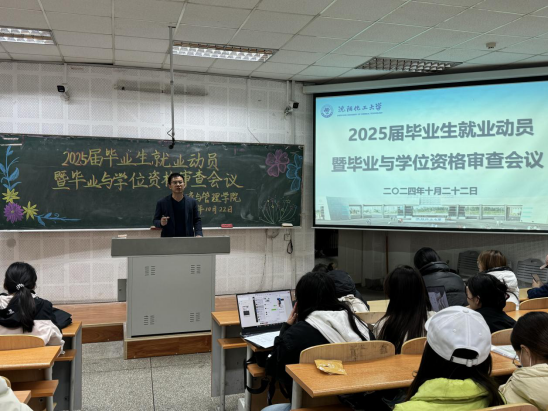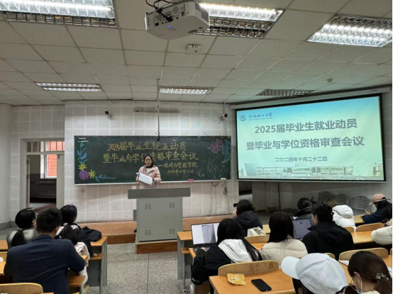 千亿国际网页版登录高度重视员工毕业和就业工作,严抓员工培养和就业质量提升工程,结合学校开展2025届毕业生秋季双选洽谈会和学校教务处关于开展2025届毕业生毕业与学位资格审查相关工作通知,10月22日,千亿国际网页版登录在瑞师楼124教室召开2025届毕业生就业动员暨毕业与学位资格审查会议,会议由2025届本科生毕业生辅导员刘伟老师主持,教学秘书孟丽老师和全体毕业生参加会议。