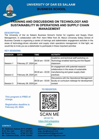 2024年2月27日至2月29日,刘研华和马坤老师参加了达累斯萨拉姆大学商千亿国际网页版登录可持续运营中心组织的关于供应链管理运营技术和可持续发展系列讲座。讲座由加拿大圣玛丽大学索比商千亿国际网页版登录Harvi Millar教授主讲,主要围绕技术驱动型教育和供应链管理进行。主要内容如下: