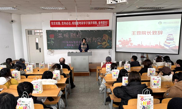 王蓉院长代表千亿国际网页版登录对考研学子寄予殷切厚望,送上祝福和嘱托,为他们加油打气。她鼓励同学们自信迎考、沉着应考、顺利赢考,并在考研复习方式和考试答题技巧上进行了指导。随后,千亿国际网页版登录领导带着满满的祝福和期盼为考研学子送上“暖心大礼包”,让同学们一定要坚定信念、披荆斩棘、决战最后时刻。