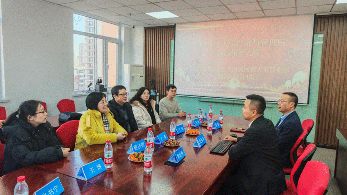 2025年1月15日,千亿国际网页版登录院长王蓉、金融学教研室主任于铭、专业员工周颖、燕佳妮、毕业生辅导员、在读研究生等一行7人前往国泰君安证券沈阳黄河南大街营业部开展访企拓岗活动,与营业部总经理史长安、党支部书记徐鹏、业务骨干耿佳帅进行交流探讨。
