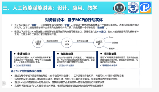 主讲嘉宾林剑平副院长围绕四大核心模块展开深度分享:在政策解读环节,系统梳理了“十五五”规划建议、教育强国建设规划纲要等国家层面关于人工智能产业发展与教育数字化的战略部署,解析了会计行业人才发展规划对复合型财会人才的需求导向;在行业痛点分析部分,精准剖析了传统财会实务中存在的“数据孤岛”“决策依赖经验”“流程僵化低效”三大结构性障碍,结合非结构化数据利用不足、复杂场景认知过载等实际问题,阐明了数智化转型的紧迫性;在实践应用分享中,通过财务智能体开发案例、RAG检索增强生成技术应用、多智能体协同工作模式等实操案例,生动展示了人工智能在财务审计、数据分析、风险管控等场景的落地成果;在课程体系构建环节,基于“以赛促改、以赛促建、以赛促教、以赛促学”的理念,提出了“通识素养-专业技能-行业能力”三阶递进的课程建设思路,分享了科云在AI数智财务智能体实战教学中的成熟经验。