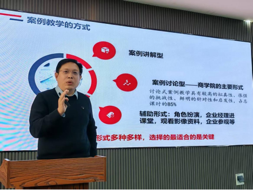 张昊教授围绕案例教学展开系统分享,以“什么是案例教学、为什么要案例教学、何时进行案例教学、何处进行案例教学、谁来实施案例教学、如何进行案例教学”六大核心问题为脉络,层层深入解析案例教学的内涵、价值与实践路径。授课过程中,张教授结合自身丰富的教学经验,用通俗易懂的语言拆解案例教学关键点,既有理论高度又有实践指导意义,让在场员工深受启发。
